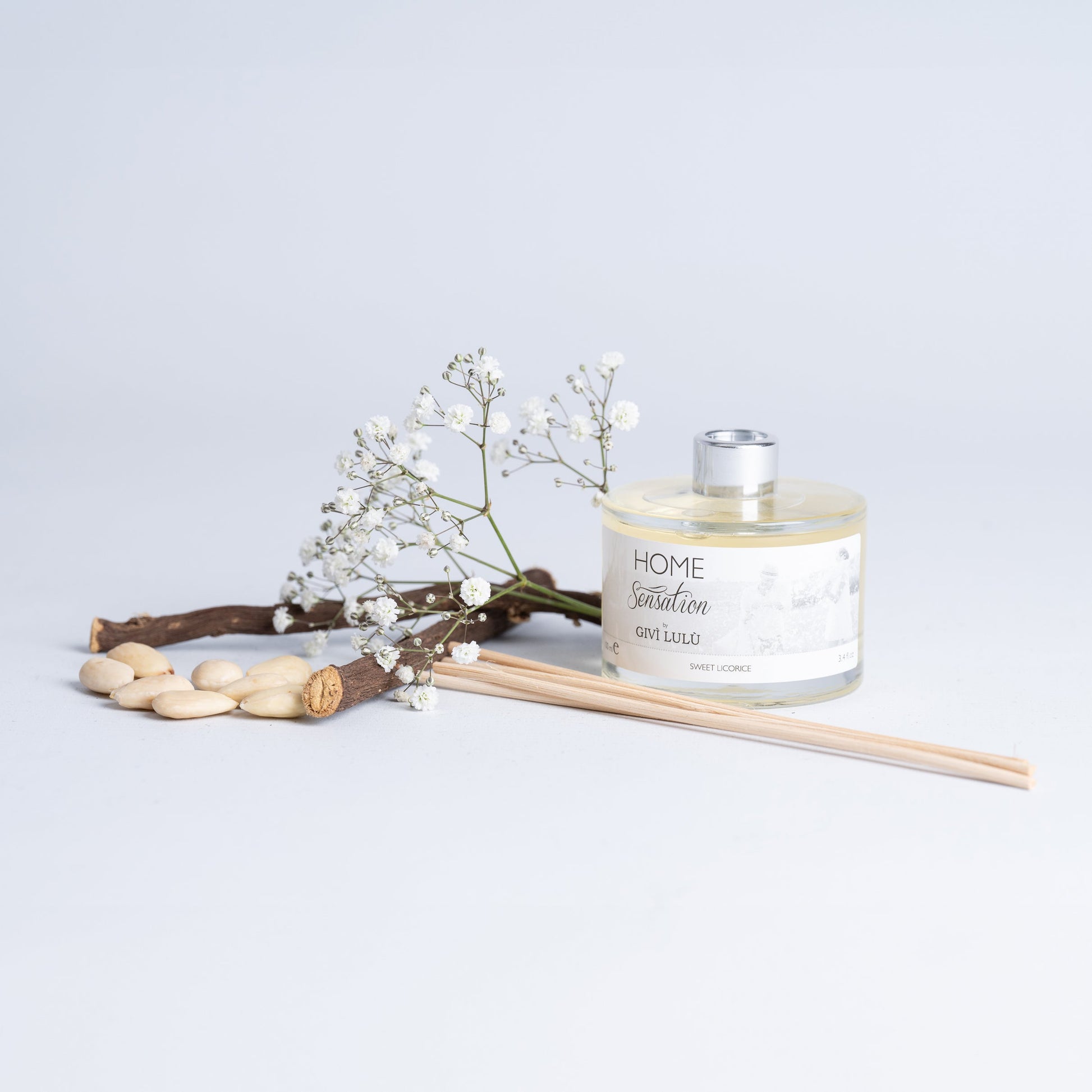 The Sweet Licorice room fragrance is characterized by a delicious prevailing aroma of licorice. Enjoy an enveloping atmosphere with its delicate and unique aroma. This fragrance, available in both spray and reed diffuser format (both 100ml), is perfect for creating a unique sensory experience.