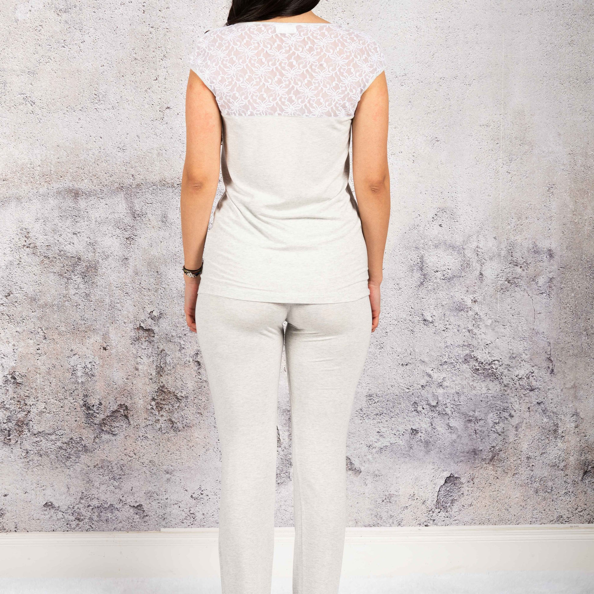 Pajama set featuring a top made of lace and soft cotton. Long trousers with a comfortable fit.